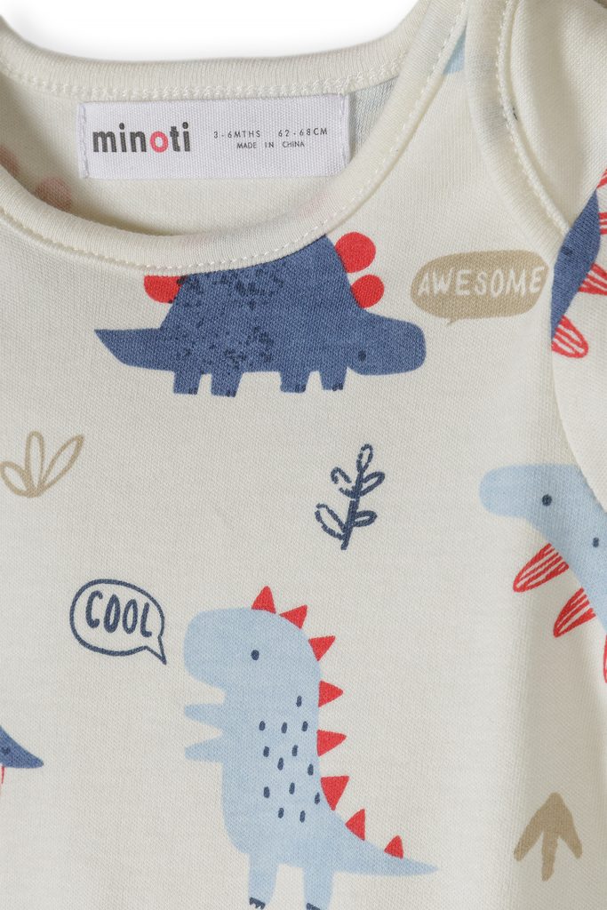 Sada obsahuje mix hravých potisků dinosaurů a univerzálních jednobarevných kousků v modré a bílé. Díky tomu snadno a rychle sestavíte outfit na každý den.