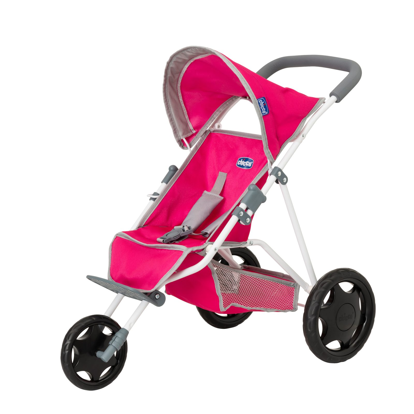 Má praktickou stříšku, stupátko, pěnovou rukojeť, košík na hračky i bezpečnostní pásy.
