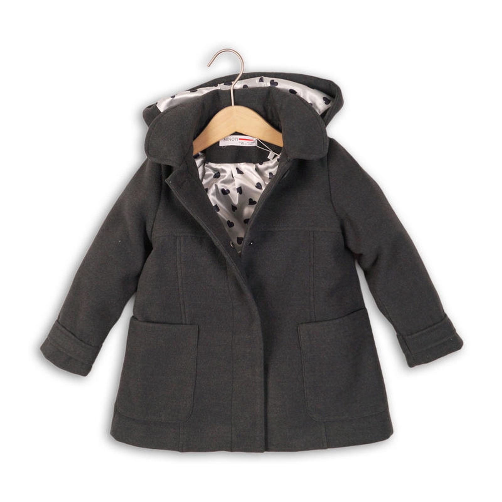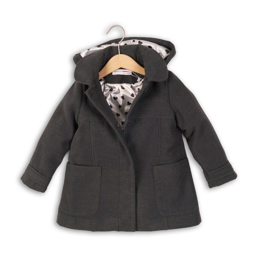 Holčičí kabát má kapucu, hřejivou podšívku a zapínání na knoflíky. V přední části má kabátek 2 kapsičky.