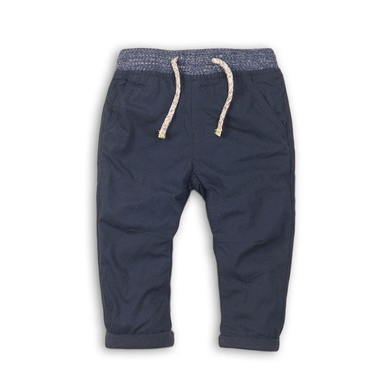 Chlapecké kalhoty z jemného plátna - popelínu. Podšívka z bavlněného úpletu. V pase guma, tkaničky ozdobné. Vpředu i vzadu kapsy. Ohrnutí nohavic je přišité.