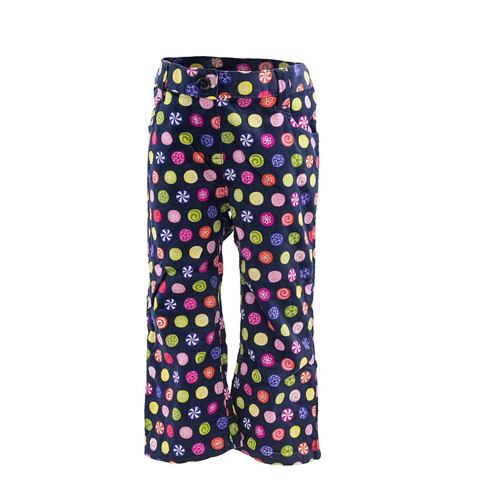 Dívčí kalhoty s atraktivním designem. Pas do gumy s imitací klasického zapínání. Dvě boční kapsy.
