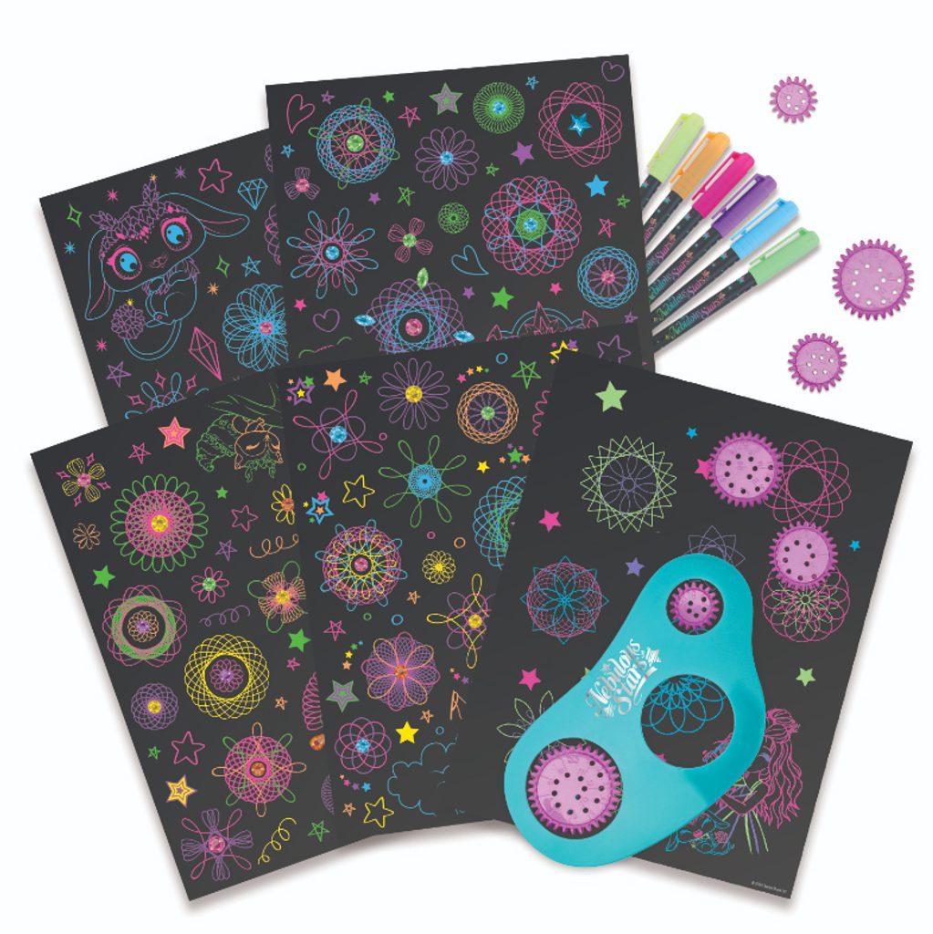Nebulous Stars Maluj hvězdné spirály set. Obsah balení - 48 černých stránek, šablona na spirály a 7 koleček, 6 neonových gelových per, stránka se samolepkami. 36 stránek má ilustrace které můžete vybarvit a doplnit spirálami.
