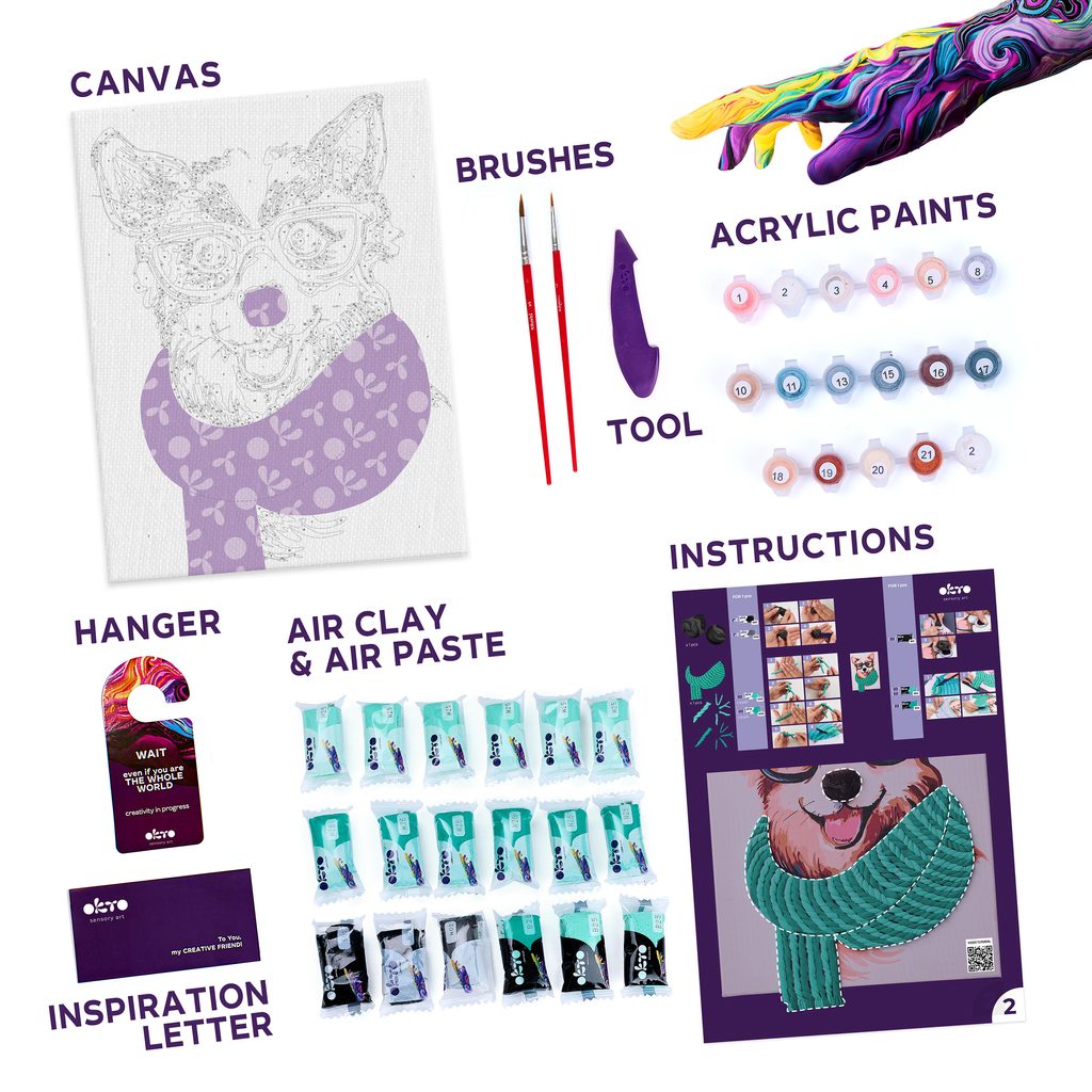 ✅ Kompletní umělecký set včetně plátna, barev a modelovací hmoty.