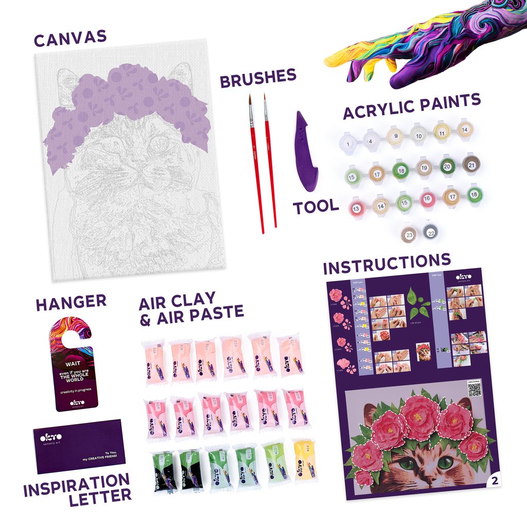 Motiv kočky s květinovou korunkou v sobě spojuje něhu přírody a hravost zvířecího světa. Je to jedna z těch sad, kde se barvy a plastická hmota doplňují v dokonalé harmonii – zatímco kočka tvoří jemný malovaný základ, květiny dodávají obrazu tu správnou hloubku.