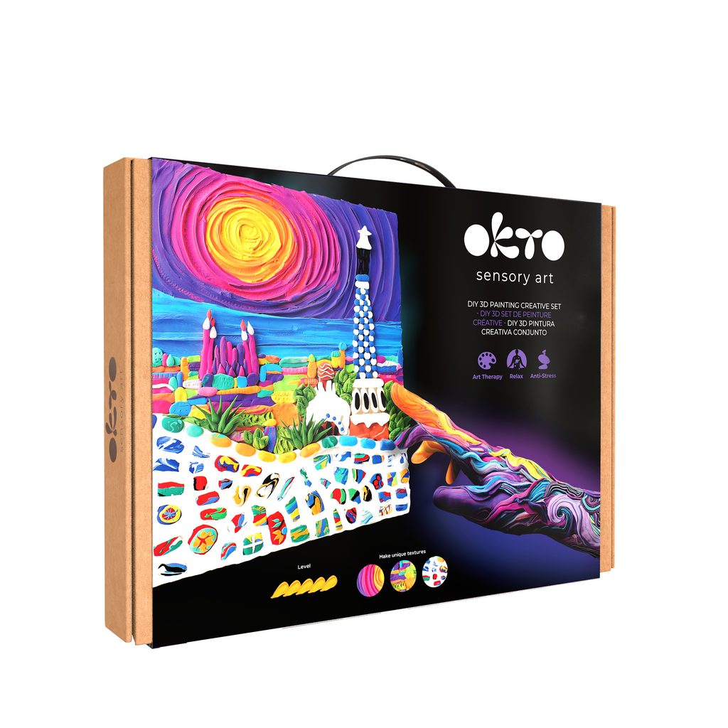 Poznejte jedinečnou krásu architektury Antonia Gaudího s kreativní sadou OKTO Malování hmotou. Na přírodním plátně o velikosti 30 × 40 cm si díky modelovací hmotě a barvám vytvoříte originální 3D obraz inspirovaný slavným parkem Güell v Barceloně. Hotové dílo se stane stylovou dekorací i originálním dárkem.
