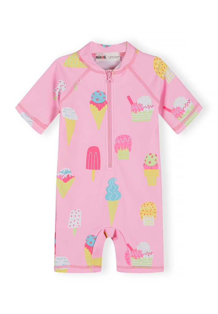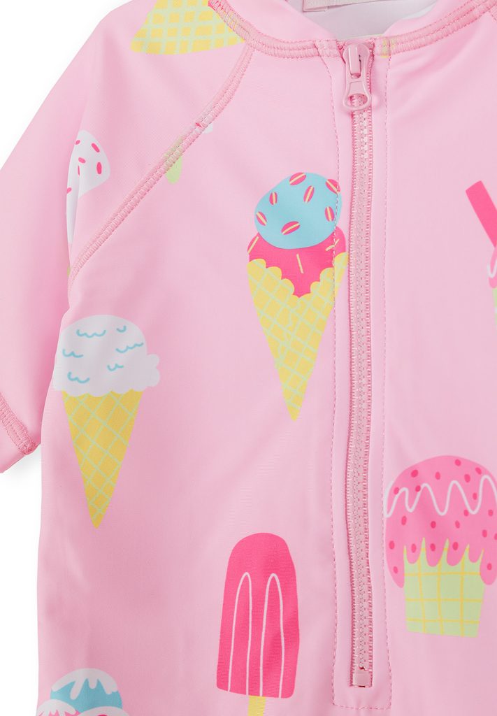 Spojte styl, pohodlí a ochranu před sluncem s těmito rozkošnými jednodílnými plavkami! Díky zářivě růžové barvě s veselým potiskem zmrzlinek a praktickému střihu s krátkým rukávem jsou ideální volbou pro všechny malé milovnice vody.