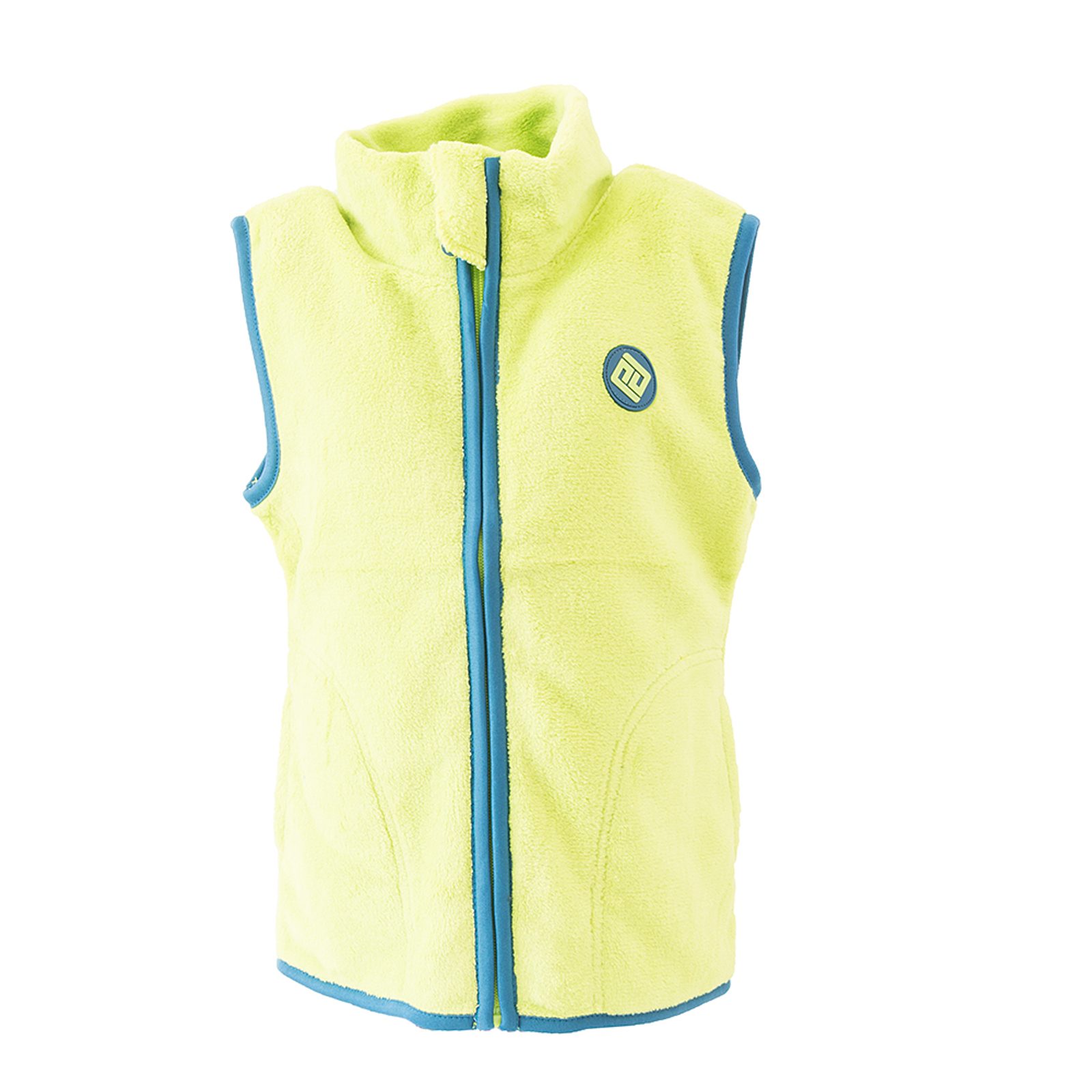 Dětská propínací chlupatá vesta v zelené barvě. Stojací límec, dvě kapsy, barevné kontrastní lemy.